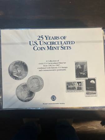 a collection of every US uncirculated mint set from 1962 to 1987 combined with historic US stamps and commemorative postmarks. this is a complete set in original binder.. I did not take a picture of every page so if there’s anything you’d like to see send me a text and I will send more pictures
