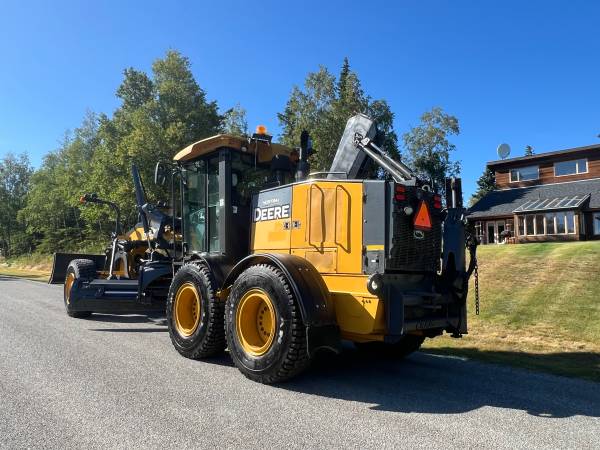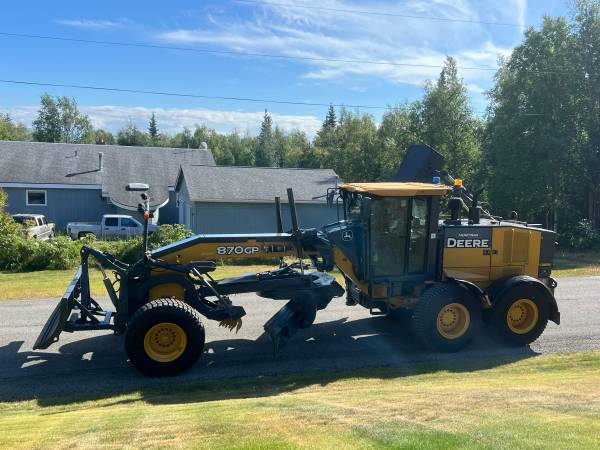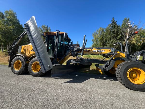 2011 John Deere 870GP Motor Grader with belly blade, scarifier, side wing & front plow attachments. Was serviced every 250 hours and runs beautifully. Has a Groenveld Auto Greasing System (was just inspected and serviced by Groenveld 7/22/25). Kingpins and Tie Rods replaced Oct. 2023