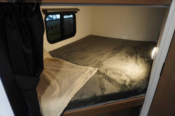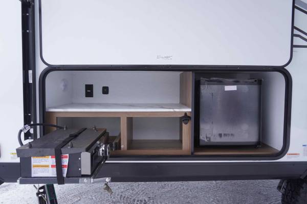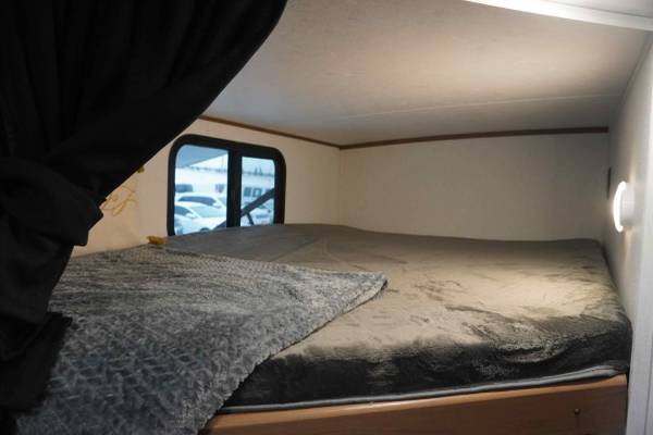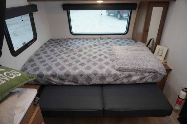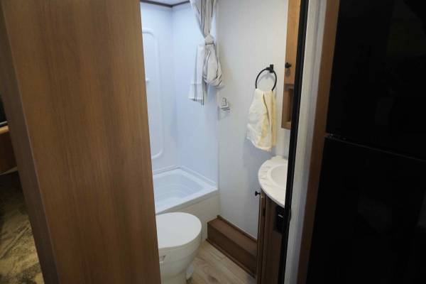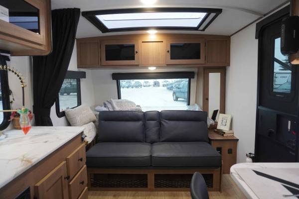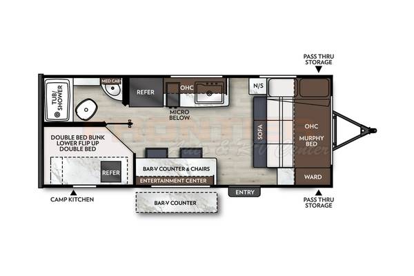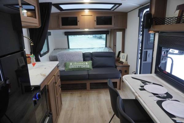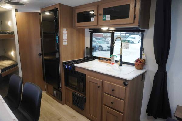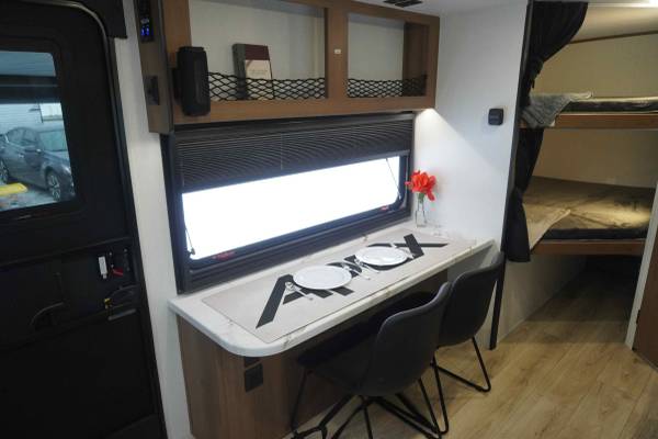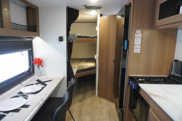 As you step into this versatile travel trailer, you'll be greeted by a front Murphy bed that offers the best of both worlds, a comfortable place to sleep at night and a cozy sofa for daytime lounging. Convenient storage is provided with a wardrobe at the foot of the bed and a nightstand on the other side for your essentials. In the center, the kitchen is fully equipped with a 10-cu. ft. refrigerator, a 2-burner cooktop, and an air fryer microwave, giving you all the tools you need to prepare your favorite meals. Across from the kitchen, a counter with chairs offers a welcoming space to dine, work, or gather. Toward the rear, double bed bunks provide additional sleeping space, with the lower bunk flipping up to reveal extra storage for your gear. Rounding out the layout is a full bathroom in the rear corner, featuring a tub/shower combo so you can enjoy the comfort and convenience of bathing right inside your trailer.