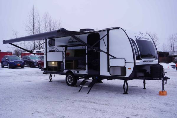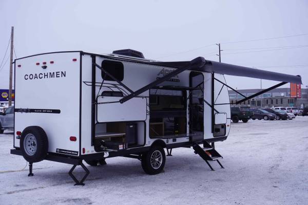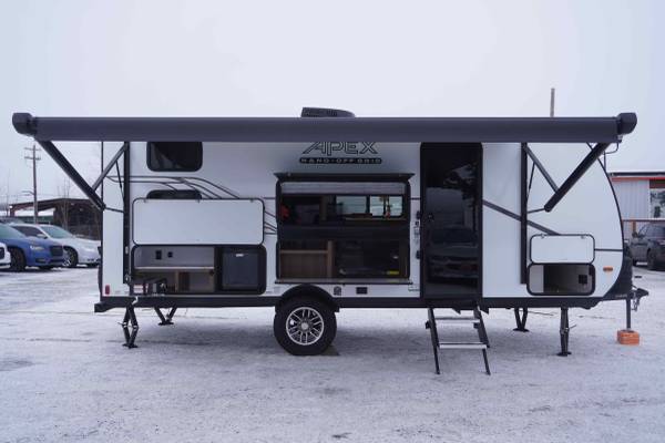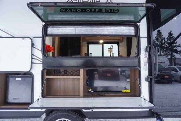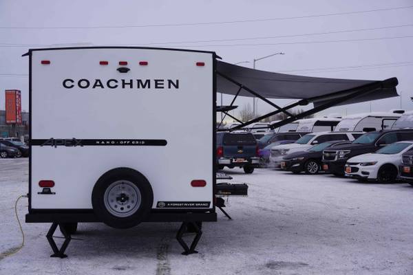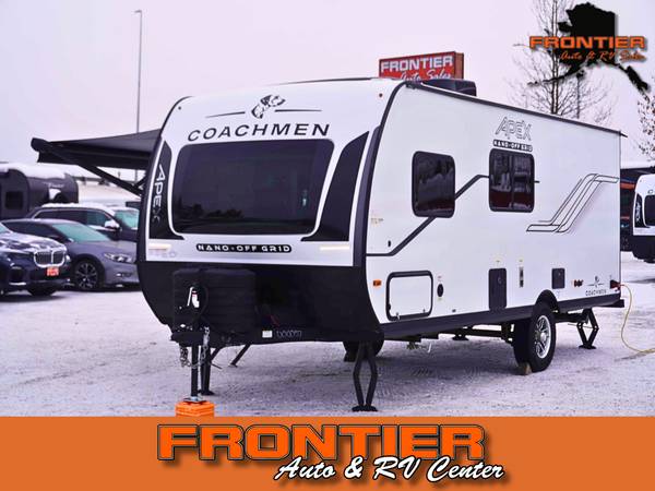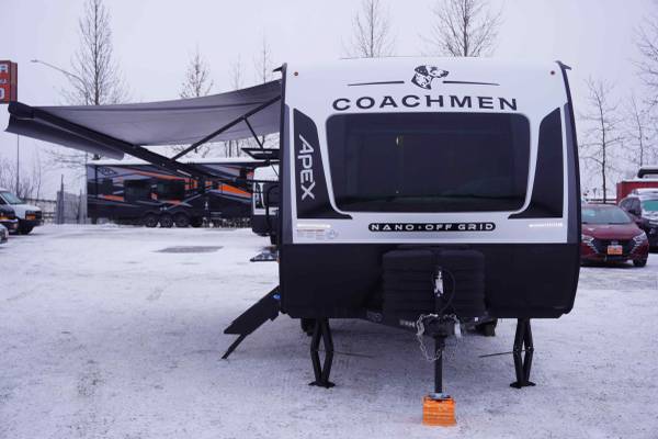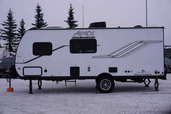 You will find comfort, convenience, and a sturdy construction with each of these Coachmen RV Apex Nano travel trailers! They are held together with an aluma-cage construction, an I-beam chassis, plus vacuum-bonded laminated dual Azdel fiberglass walls for double the protection against the elements. The 400-watt solar panel with a 30-amp control charger is included, along with two 20 lb. LP tanks, a high velocity power roof vent, plus 12V outlets to keep you powered up. More exterior features include a hot/cold shower, four stabilizer jacks, a power awning with LED lighting, and radius thumb latch baggage doors to easily pack and unload your gear. You will love the interior of your Apex Nano with Congoleum residential flooring, one-piece seamless edge countertops, matte black hardware in the galley, and a hand-crafted wood medicine cabinet in the bath.