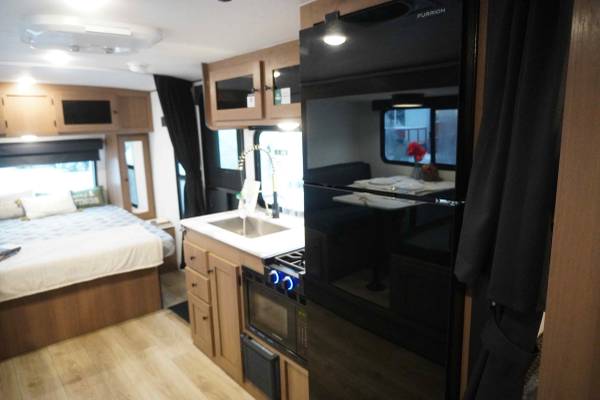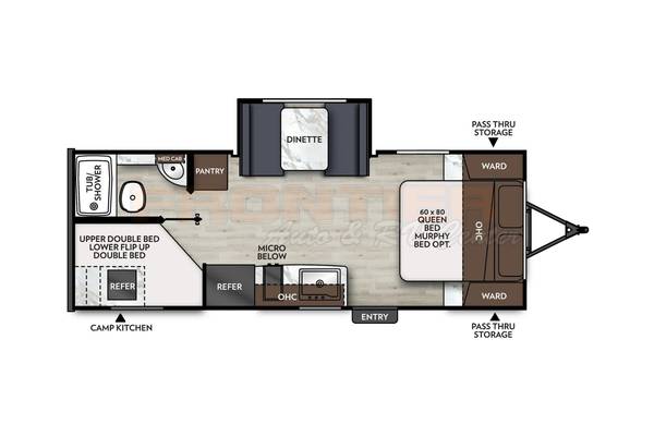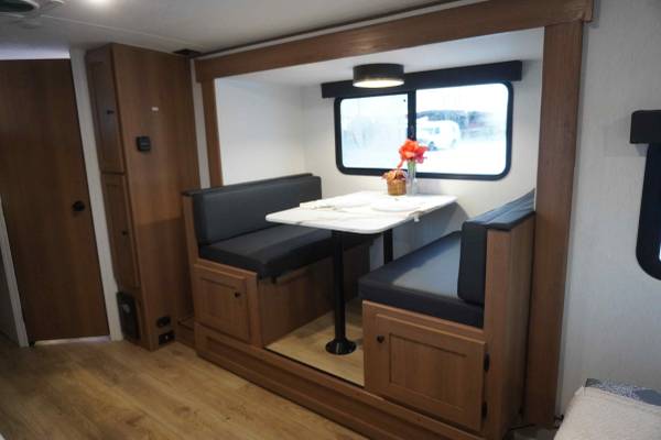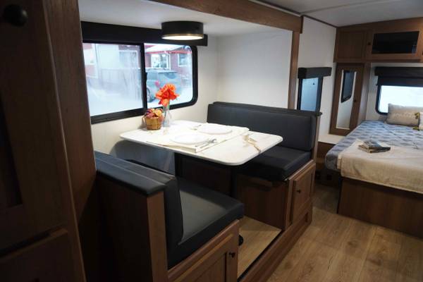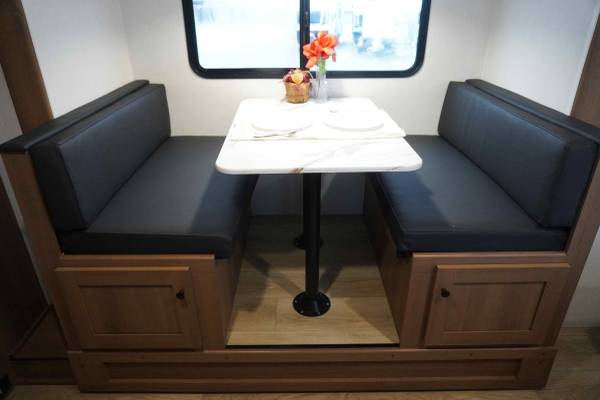 The kitchen keeps things simple and efficient with a two-burner cooktop, microwave, 10 cu. ft. refrigerator, pantry, and a booth dinette housed in the slide-out—giving you more elbow room when everyone piles in for breakfast. The rear corner bathroom features a tub/shower combo, perfect for rinsing off after hikes, fishing trips, or muddy campground adventures.