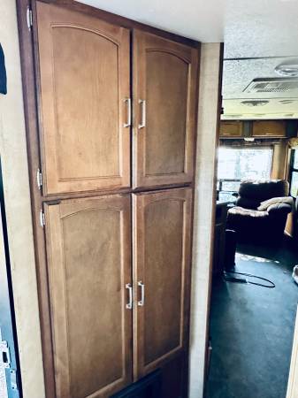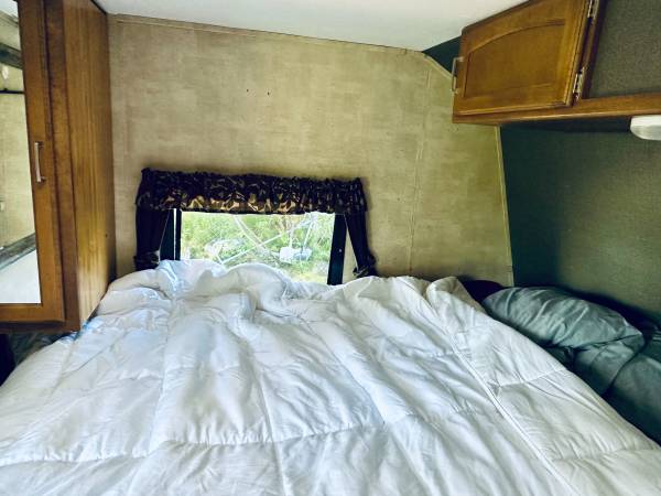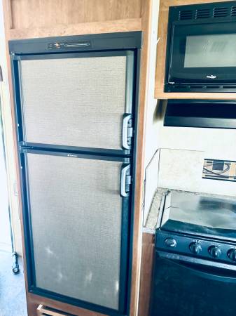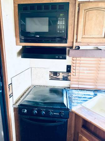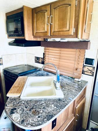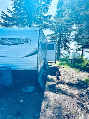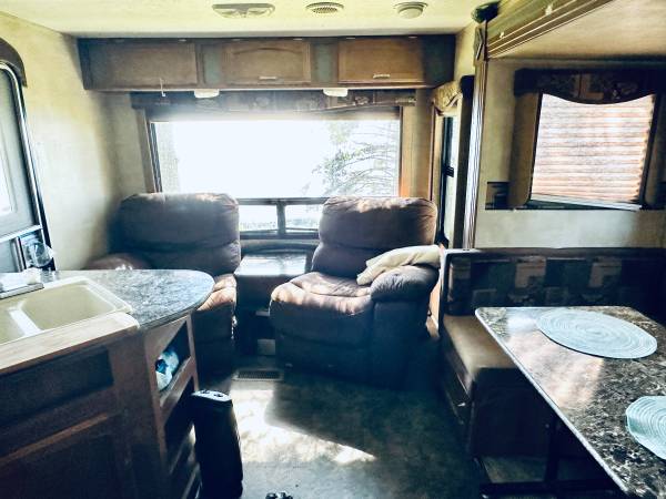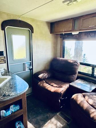 2015 Keystone Springdale RV M258 RL Weight 6040, 1 electric slide at dining room, enclosed under belly, upgraded refrigerator/freezer, small tv w/AM/FM cassette stereo/cd player, electric awning, power tongue jack, stabilizer jacks, tri fold sofa (folds down into a bed) free standing dining table, 2 manual recliners, 4 burner gas stove w/ gas oven, lots of kitchen cabinets, microwave, 1 king size bed w/ big storage area under mattress, one bathroom; standing shower w/glass door, foot flush toilet, sink w/medicine cabinet, long standing cabinet for towels. Air conditioning, 2 entry doors, all window & screens intact w/ blinds