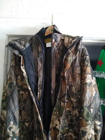 Bear Creek outfitters insulated hooded coat with zip out matching liner. This jacket is the longer length which keeps you warmer with the Mossy Oak Break-Up camo. Worn 2 X’s and is like new...